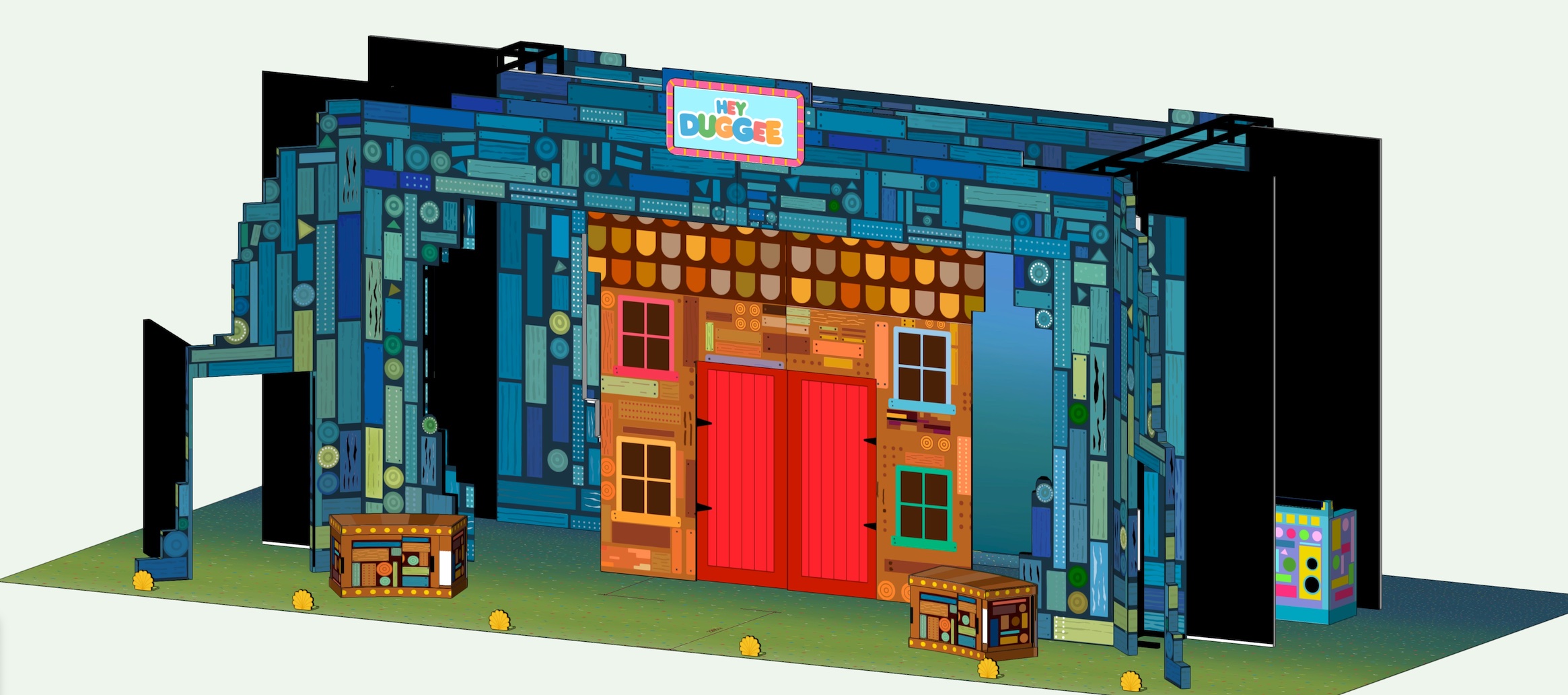 OLIVIER WINNER BEST FAMILY SHOW 2023. Set and costume designs for the Kenny Wax stage adaptation by Matthew Xia and Vikki Stone, based on much loved BBC TV series of Hey Duggee created by Grant Orchard. Bringing such a well loved TV series to life on stage was a delight. The responsibility of being faithful to the television show, but also realising the animated characters in 3D was a triumph for the fabulous puppet designers Yvonne Stone and Daisy Beattie. The set provided the environment for those characters to experience their various adventures. With the clever writing by Vikki Stone and Matthew Xia's creative direction the show is a fabulous first theatre experience for many very young audience members. Using the colour palette of the Hey Duggee animation world and the planking graphic style of the clubhouse, the bright tones but simple in hues allow the puppets to operate freely without competing with them. The planking colours suggest landscape, from greens to blues but also helps gives us the interior worlds. The squirrels journey through the colourful Landscape, Club House Interior, Space, then finally arriving at the theatre, with splashes of bright colour punch ing through the planking set. The designs for our one multi-roll actor - Lunga Anele-Skosana, who switches costumes in a series of quick changes, becoming a variety of 'human' versions of other popular characters from the series. Simple hat style animal heads, coats and jackets, or part puppet part costume additions, create Chew Chew, Hennie and Mrs Weaver. Sparkly and inventive lighting design by Ciaran Cunningham, beautiful animated video by George Reeve and sumptuous sound by Rob Bettle all create the necessary environment to help transport our characters on their adventures.